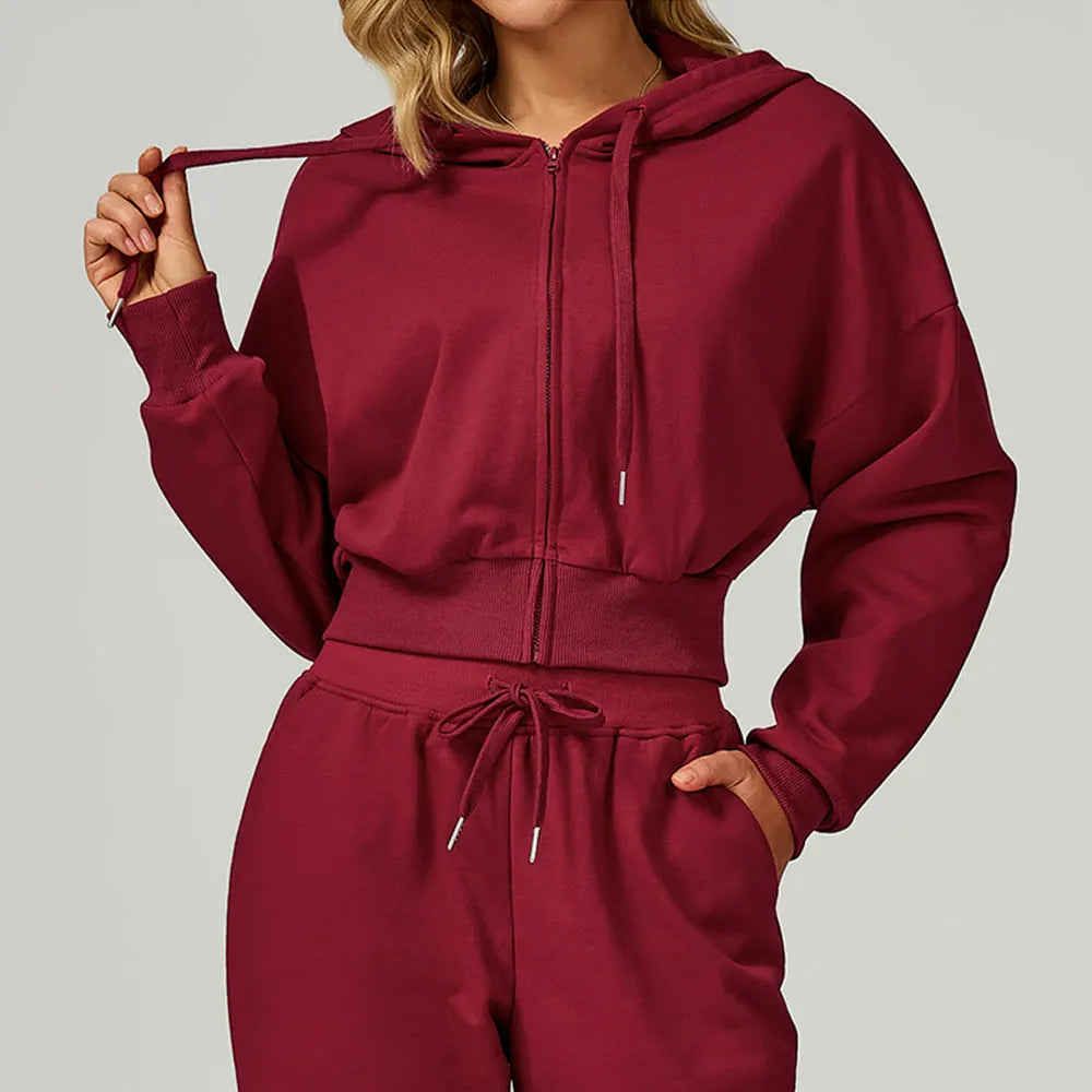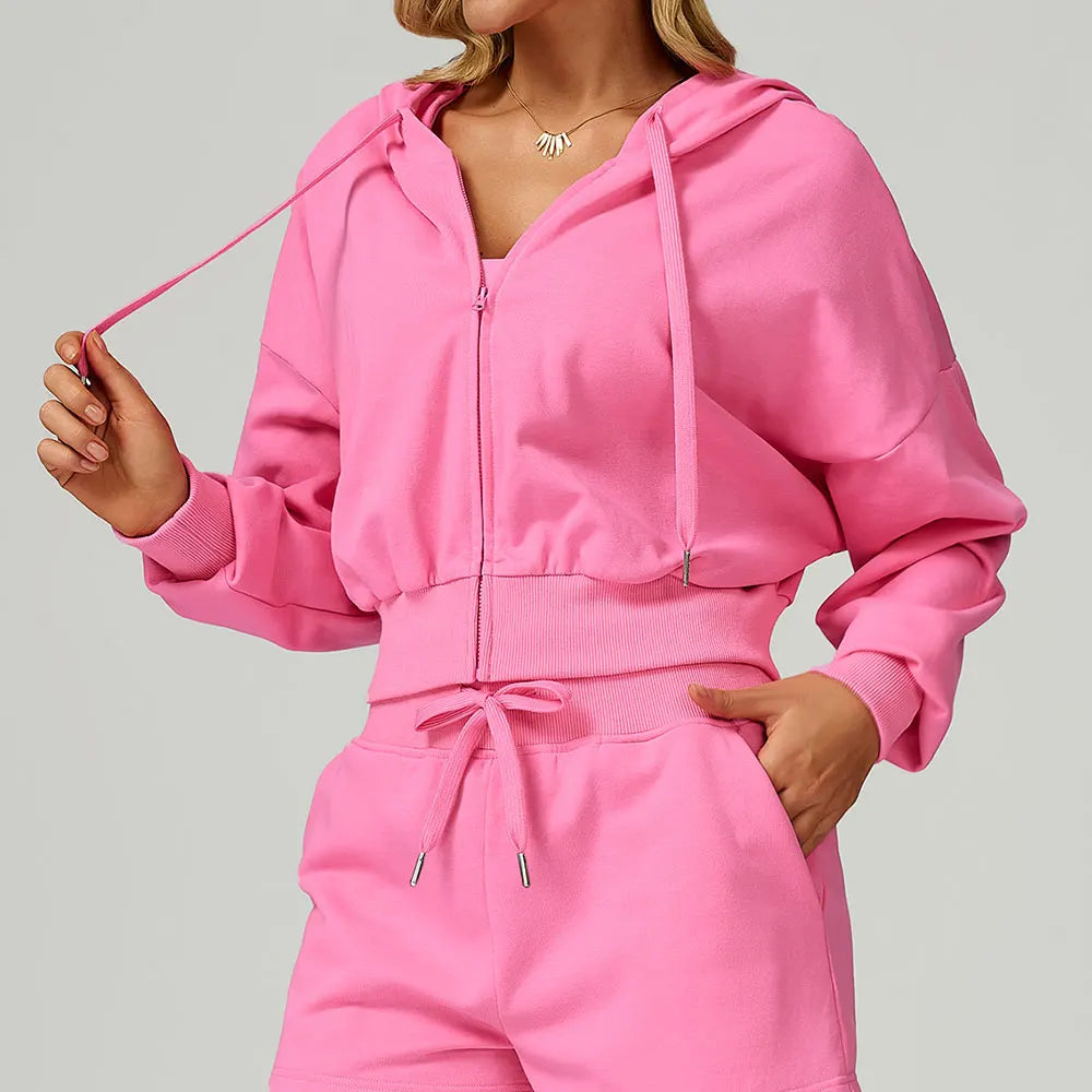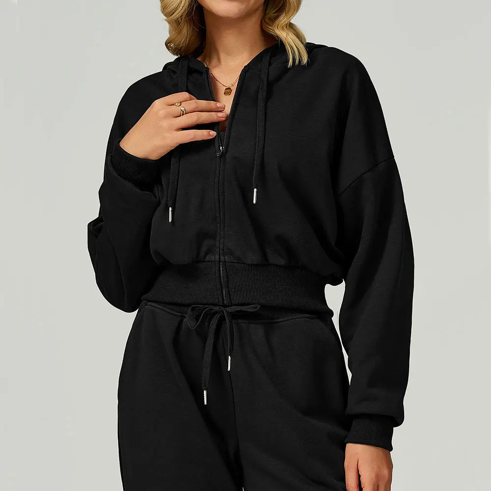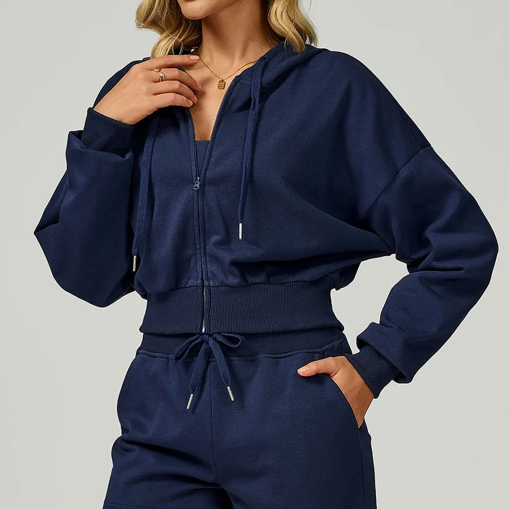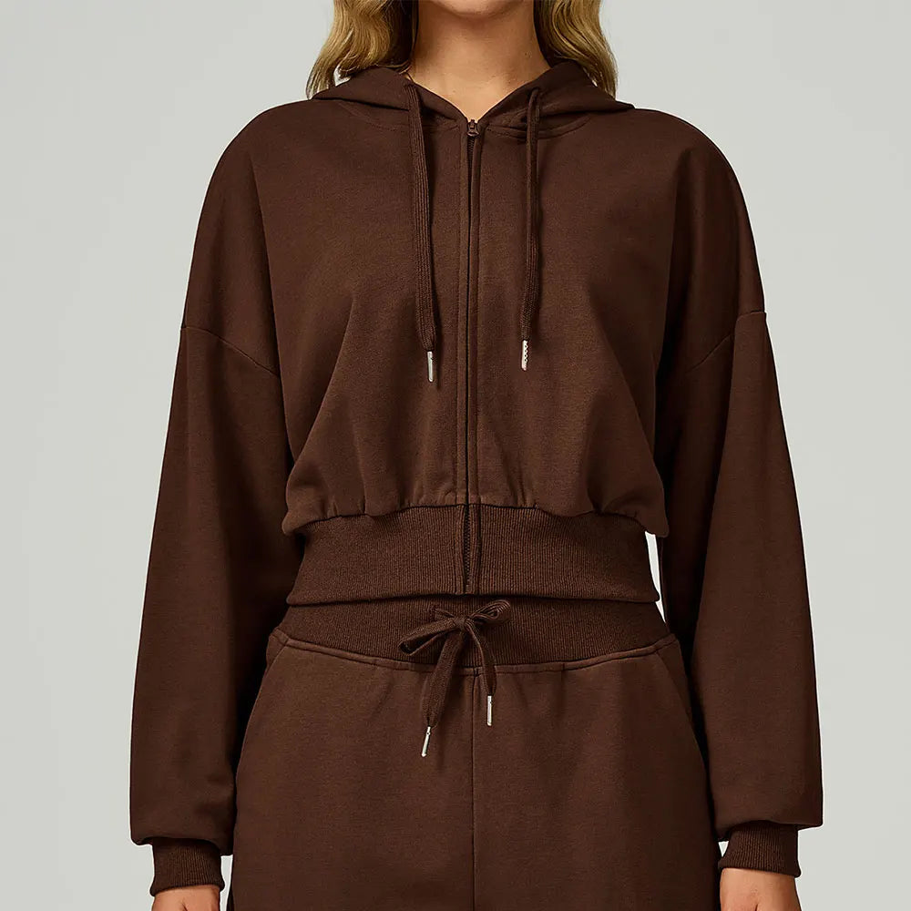 Confeccionado em tecido de moletom (algodão e poliéster), é ideal para esportes ao ar livre ou momentos casuais. Possui capuz, zíper frontal e toque macio.